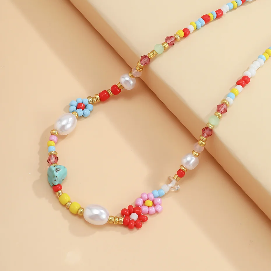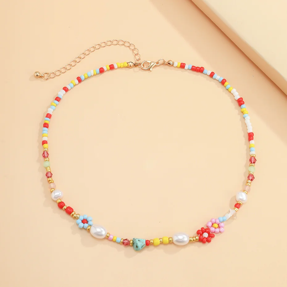 Baroque Simulated Pearls Cute Flowers Colorful Hand-woven Beaded Short Clavicle Chain Choker Necklace For Women Girls Jewelry